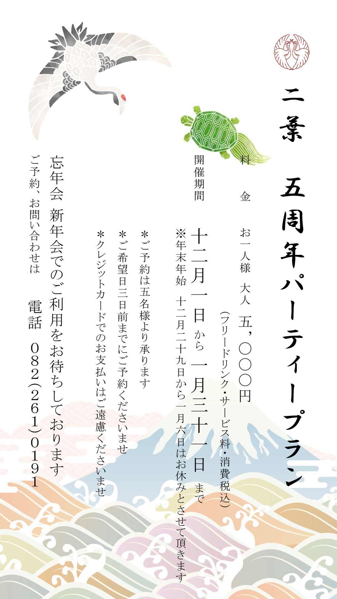 料亭「二葉」からのお知らせ 2018年11月8日 鶴羽根神社の敷地内に隣接し、結婚式披露宴をはじめとするお祝いごとに長年のご愛顧を賜っている料亭「二葉」から、年末年始にお楽しみいただけるお料理、プランのご案内です。ご家族、ご友人、お仲間とぜびご利用ください。 料亭「二葉」の河豚コース 料亭「二葉」のおせち料理 料亭「二葉」五周年パーティープラン お問い合わせ&ご予約は下記へお願いいたします。